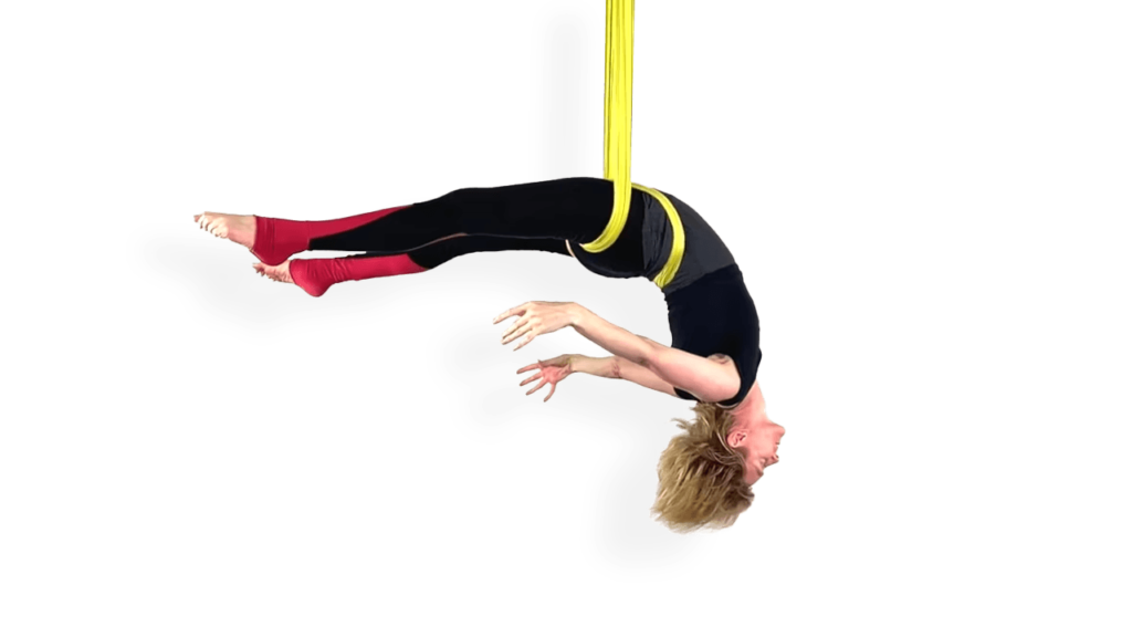 These are the next steps we teach to our aerial sling students after they’re comfortable with Inside Seatbelt: Forward and Backward Rolls. The next steps can be started right away and they lead toward specific future goals which are often the most advanced aerial sling skills.
