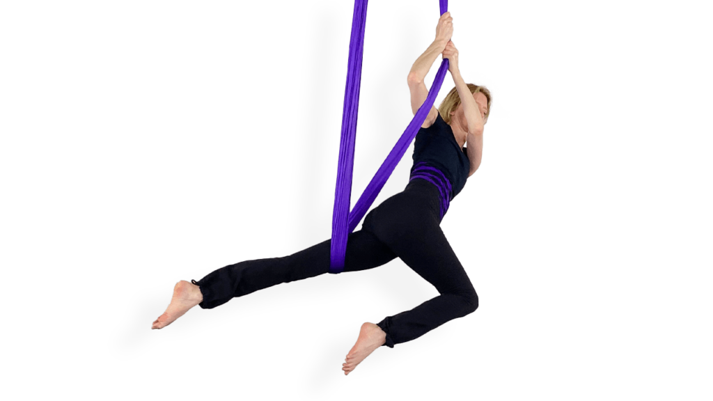 These are the next steps we teach to our aerial sling students after they’re comfortable with Single Knee Mounts. The next steps can be started right away and they lead toward specific future goals which are often the most advanced aerial sling skills.