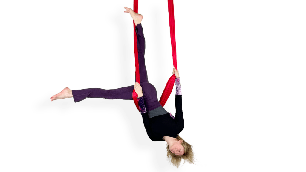 These are the next steps we teach to our aerial sling students after they’re comfortable with Swan Forward Rolls. The next steps can be started right away and they lead toward specific future goals which are often the most advanced aerial sling skills.